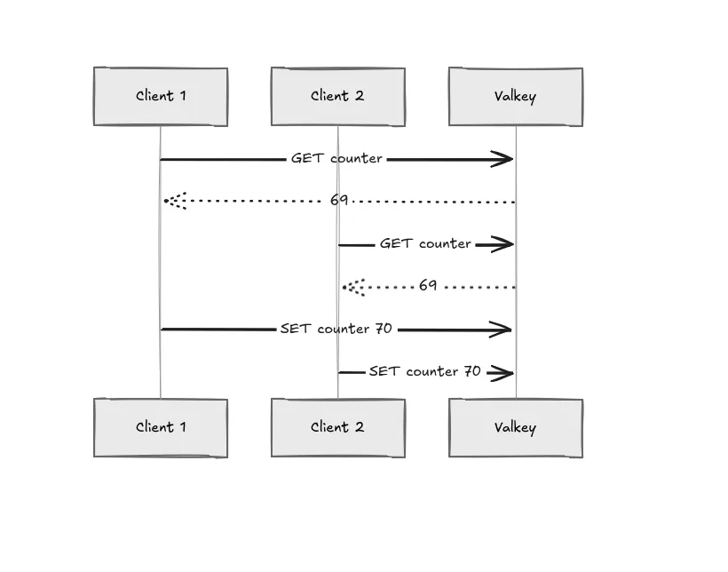 Quay lại với Valkey, chúng ta lấy ví dụ nếu không atomic.